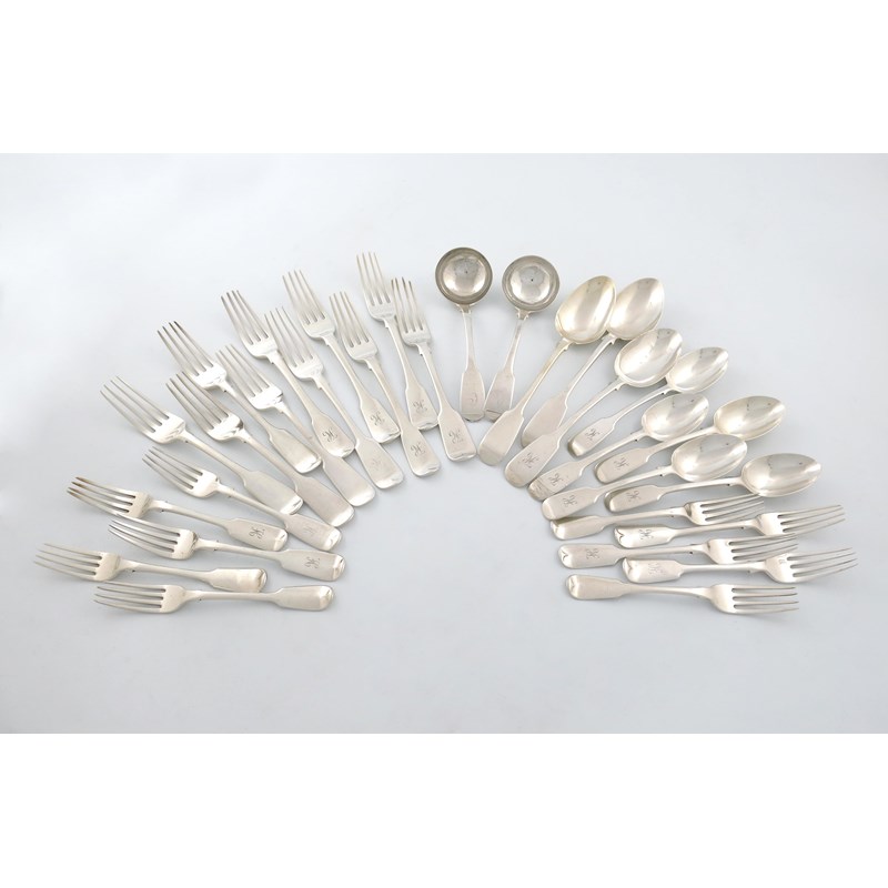comprising: nine table forks, nine dessert forks, a pair of sauce ladles, three tablespoons, five dessert spoons, many initialled plus an electroplated table fork and dessert fork, approx. weight 53oz. (30)