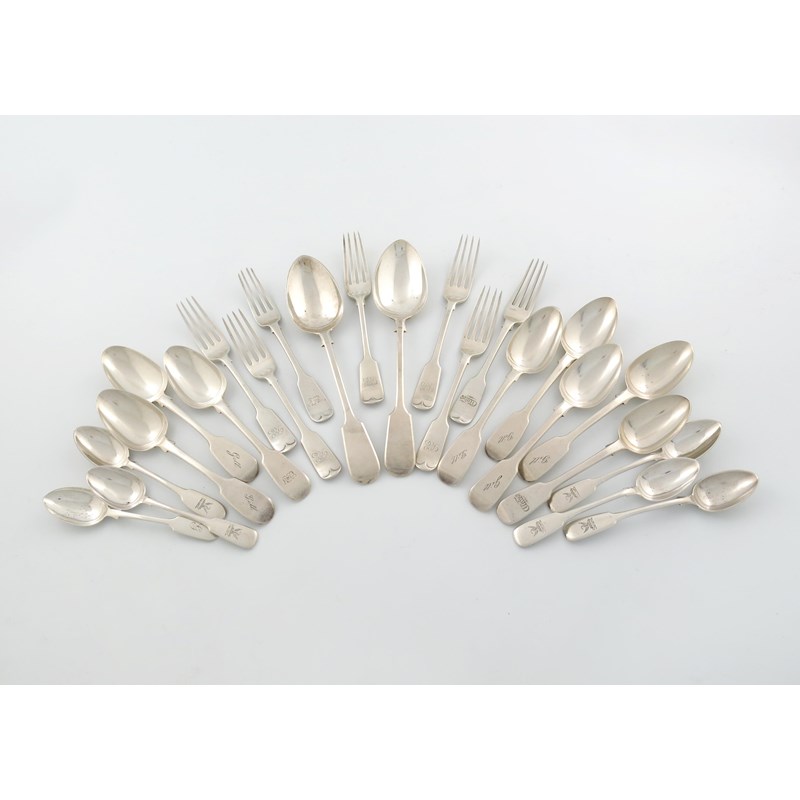 the terminals initialled and crested, comprising: eight dessert spoons, two tablespoons, seven dessert forks, plus five Russian teaspoons and another teaspoon, approx. weight 35.5oz. (23)