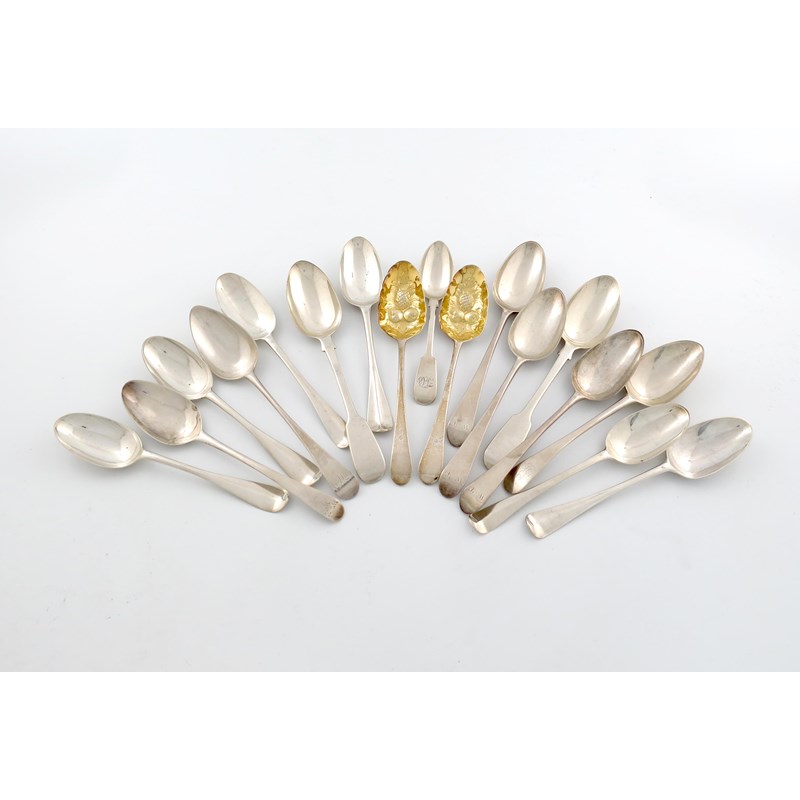 comprising: a pair of Glasgow tablespoons, probably by Bayne and Napier, Glasgow circa 1760, plus four further Hanoverian tablespoons, a set of three Newcastle tablespoons, a pair of Newcastle tablespoons, two spoons with later berry decoration, plus three other tablespoons and a dessert spoon, approx. weight 30oz. (17)