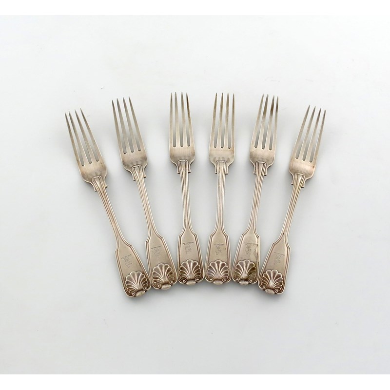 A set of six late Victorian silver Fiddle, Thread and Shell pattern table forks,