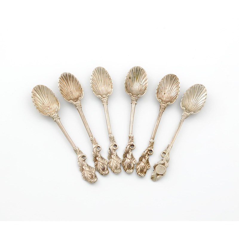shell shaped bowls, pierced foliate terminals with a vacant cartouche, length 10.6cm, approx. weight 2.7oz. (6)