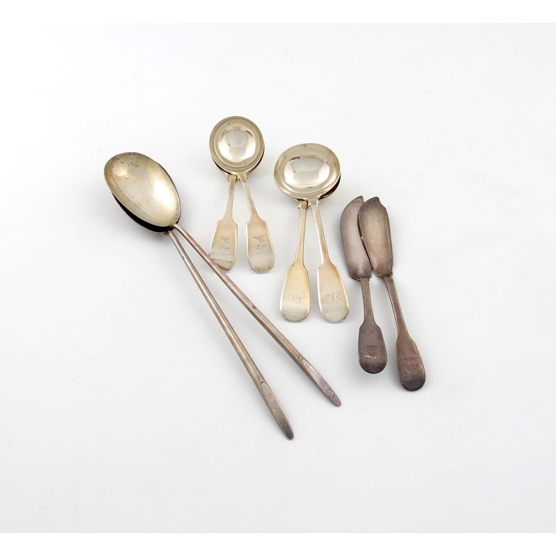 comprising: a pair of late-Victorian salad servers, by Mappin and Webb, Sheffield 1900, a pair of Fiddle pattern sauce ladles, London 1857, another pair of Fiddle pattern sauce ladles, and two butter knives, approx. weight 16oz. (8)