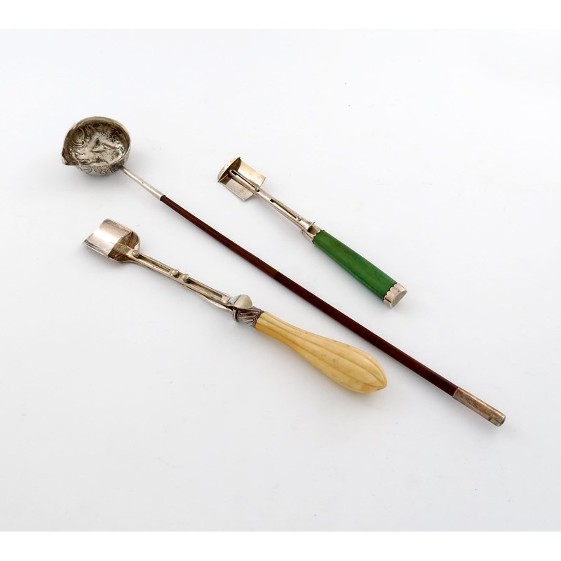 comprising: a George III silver stilton scoop, by Samuel Pemberton, stained green ivory handle, slide-action mechanism, plus an electroplated slide action stilton scoop, by Mappin and Webb, carved fluted ivory handle, and a George III punch ladle. (3)