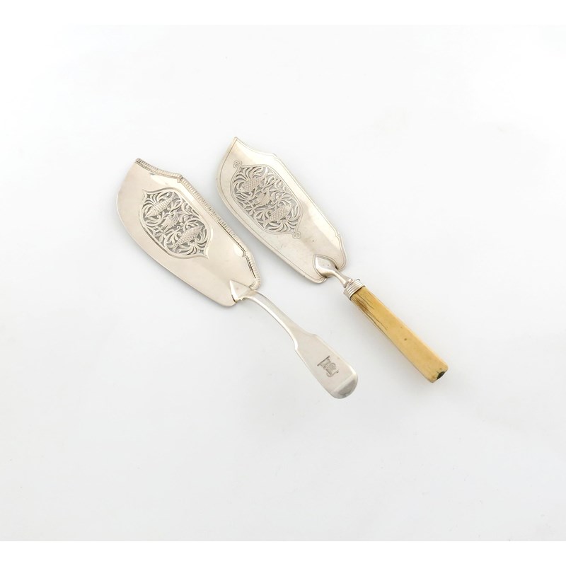 gadroon border, the blade pierced and embossed with two fish and a bird, gadroon border, the terminal with a crest, plus a George III silver fish slice, probably by the same maker, London 1819, the blade with similar decoration, tapering ivory handle, approx. weighable 4.4oz. (2)