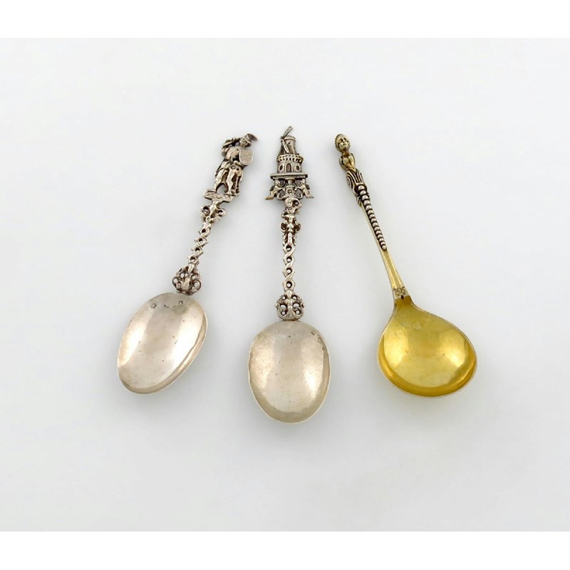 comprising: two Dutch spoons, one 1890, with a pierced figural and windmill terminal, the other with a knight finial, plus a silver-gilt spoon, maker's mark of C over IB, figural terminal, approx. weight 7.5oz. (3)