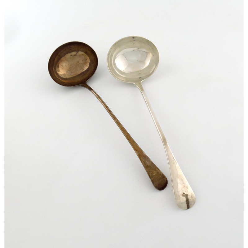 oval bowl, plain terminal, plus a William IV silver Old English pattern soup ladle, by William Schofield, London 1833, oval bowl, plain terminal, approx. weight 14oz. (2)