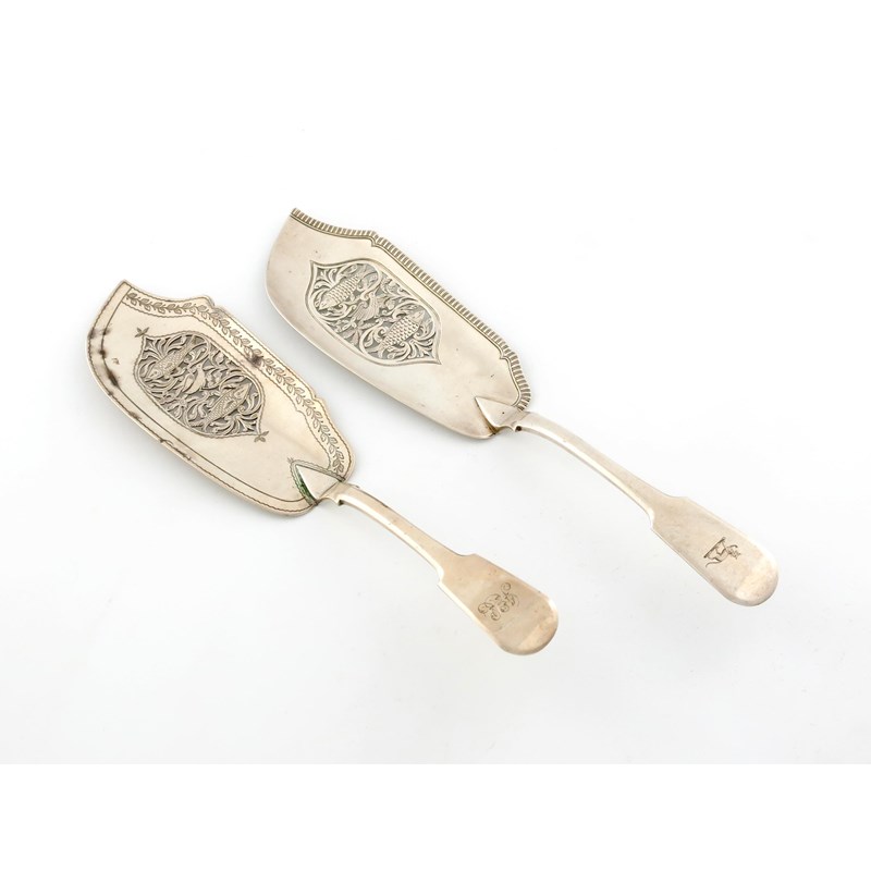 the blade pierced and embossed with two fish and a bird, gadroon border, the terminal with a crest, plus a George IV silver fish slice, by the same maker, London 1822, the blade with similar decoration, bright-cut border, approx. weight 9oz. (2)