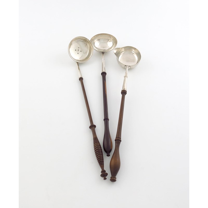 maker's mark worn, possibly by Thomas Tearle, London 1742, circular bowl with a plain lip, turned baluster wooden handle, length 36.3cm, and a George II silver punch ladle, maker's mark partially worn, G? London 1735, oval bowl, turned baluster wooden handle, length 36cm, approx. total 7.2oz. (3)