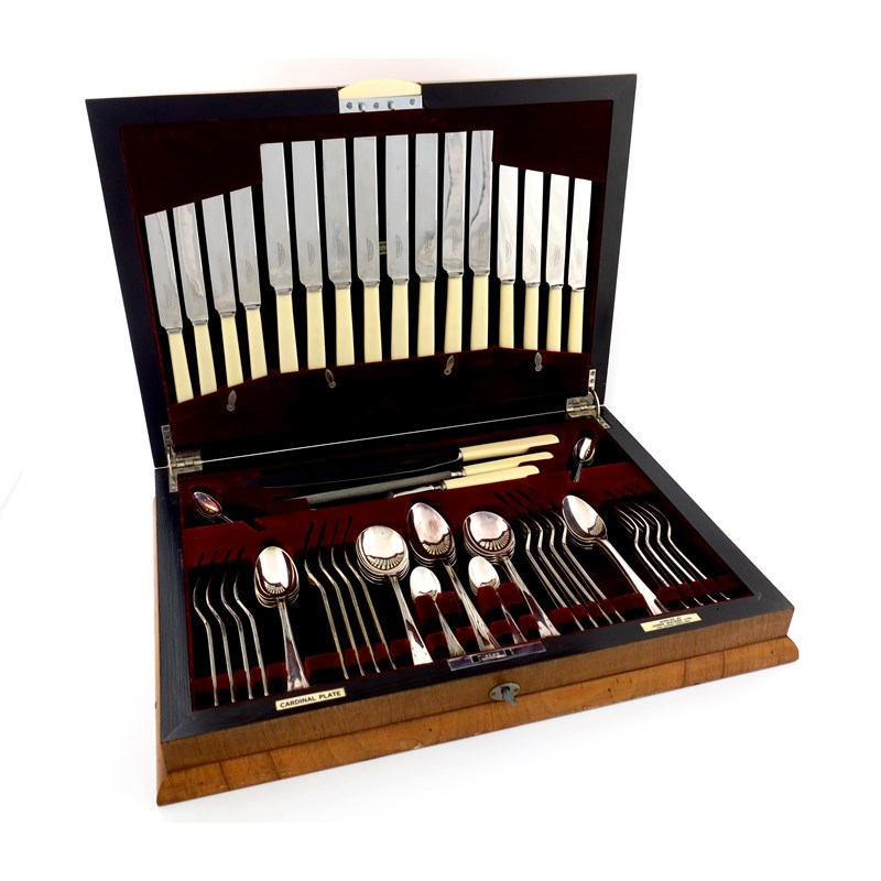 comprising: eight table forks, eight dessert forks, eight table knives, eight dessert knives, eight dessert spoons, eight soup spoons, eight teaspoons, eight coffee spoons, four tablespoons, and a three-piece carving set, in a fitted case.