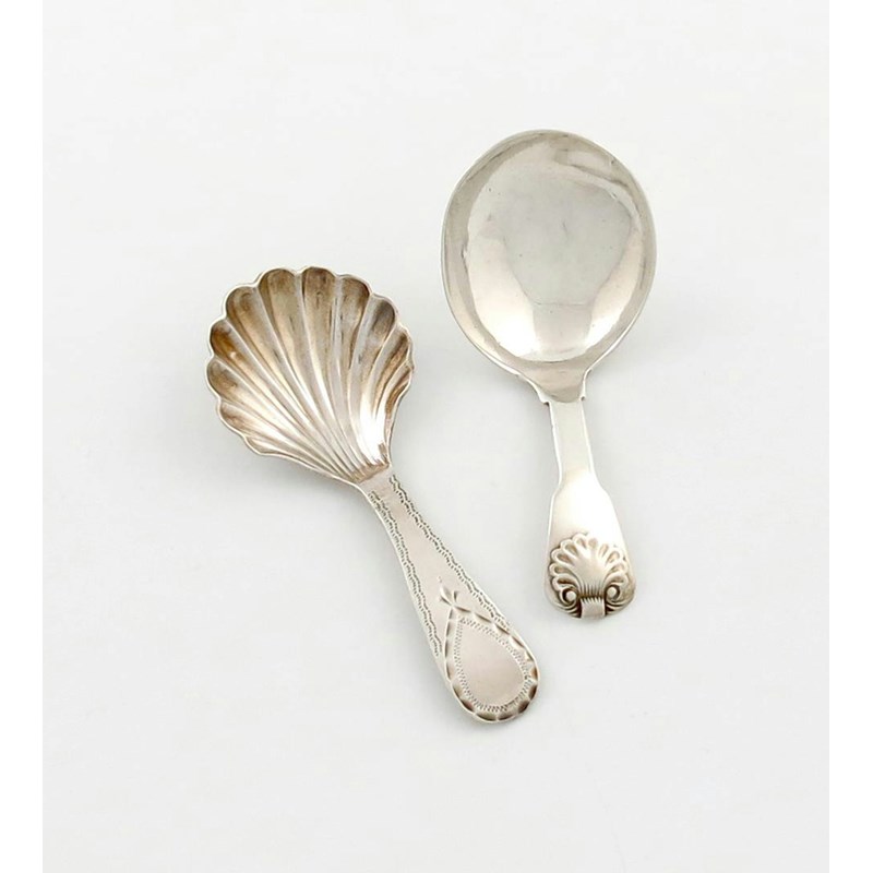 shell shaped bowl, the terminal with a vacant shield cartouche, plus a George III silver Fiddle and Shell pattern caddy spoon, by George Wintle, London 1814, approx. weight 0.8oz. (2)