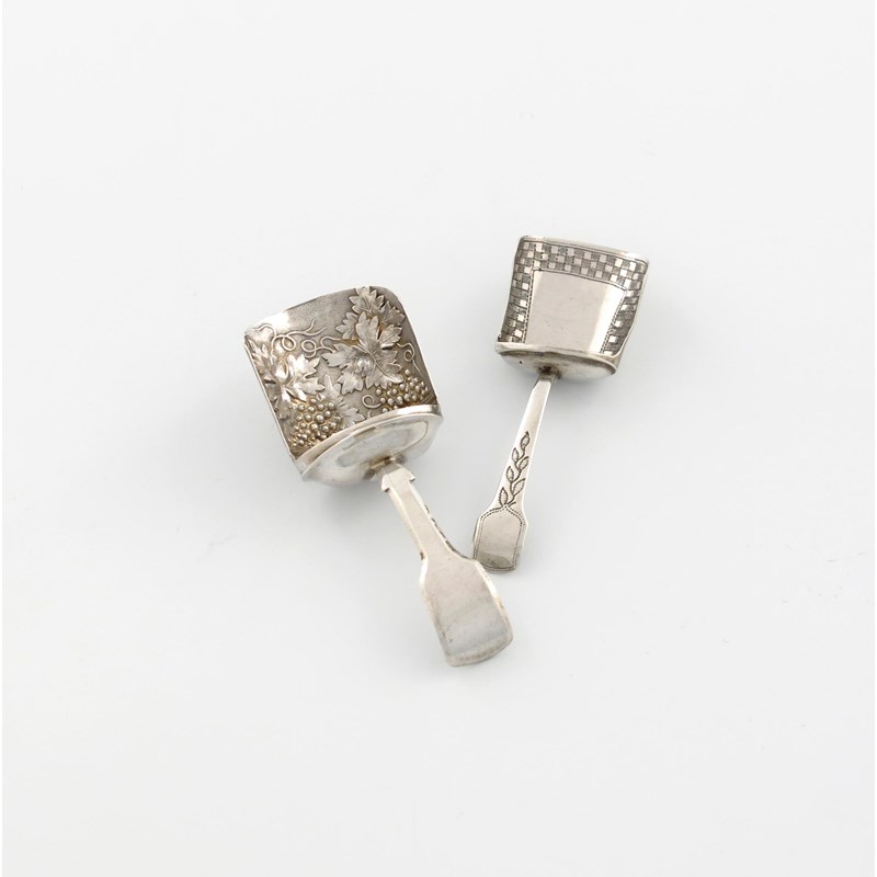 the shovel shaped bowl embossed with trailing grapevines, length 7.8cm, plus another caddy spoon by Samuel Pemberton, Birmingham 1810, similar form, with a chequer board border. (2)