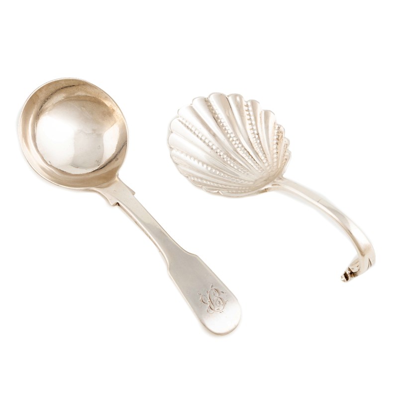 shell bowl, Onslow pattern handle, plus a George IV provincial silver Fiddle pattern caddy spoon, by Cattle and North, York 1828, approx. weight 1.6oz. (2)