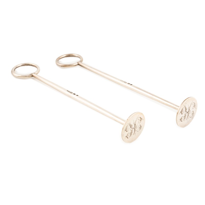 ring handles, the circular bases engraved with an initial, length 13.5cm, approx. weight 1.5oz. (2)