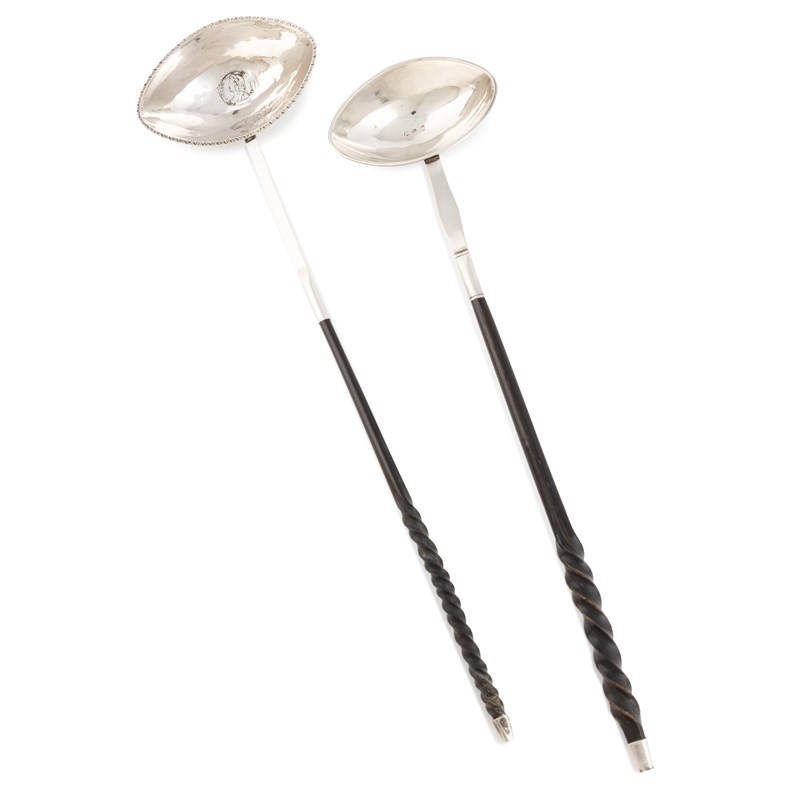 oval bowls, one set with a coin and with a bright-cut border, twisted whale-bone handles, lengths 35cm and 33.2cm. (2)