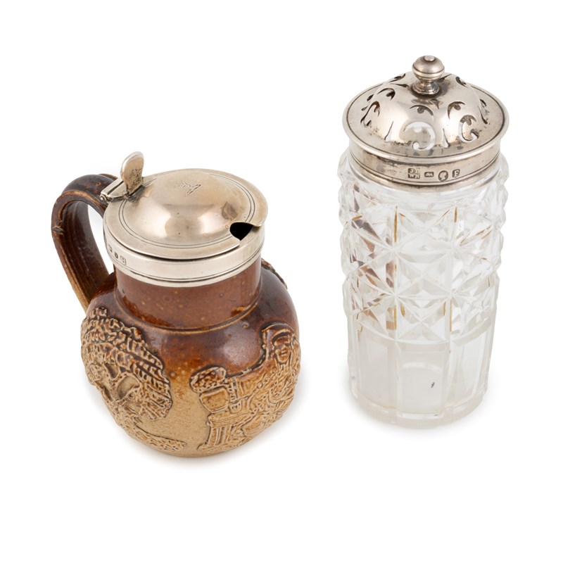 baluster form, scroll handle, domed hinged cover with a crest, height 9cm, plus a Victorian provincial silver-mounted glass condiment jar, by Barber and North, York 1841. (2)