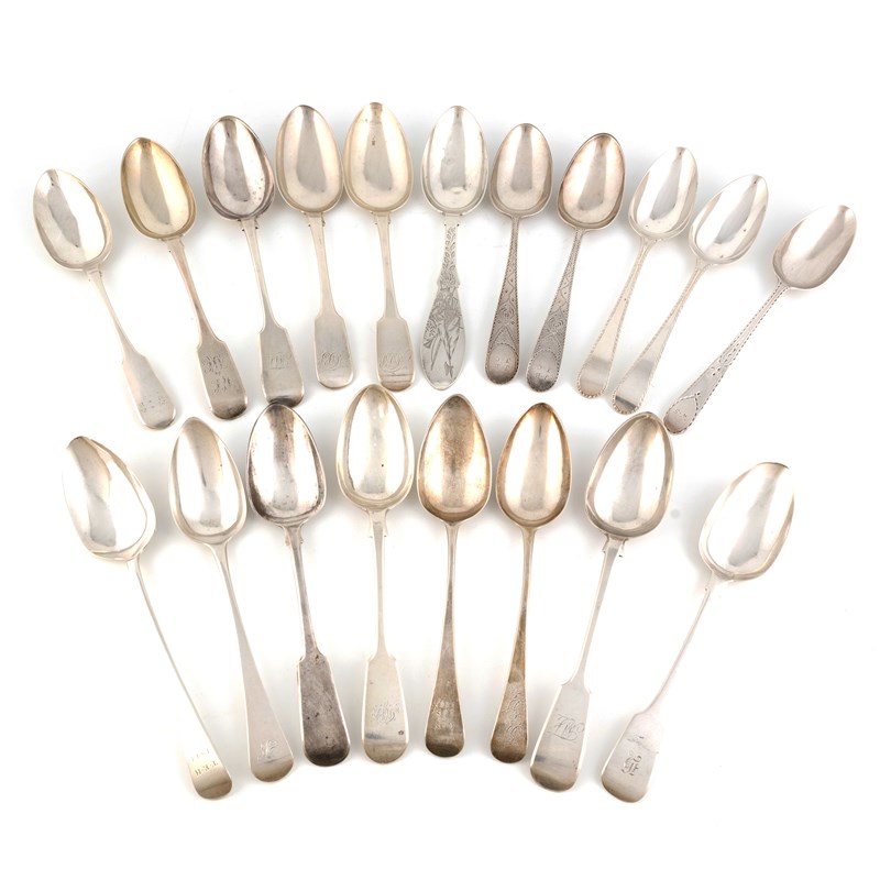 including a Victorian one by John Genge, 1874, the front engraved with a rifle, drum, flag and trumpet, the reverse inscribed 'Philip Gandin, S.W.R.C, 2nd Prize 1875', plus various others, approx. weight 40oz. (19)