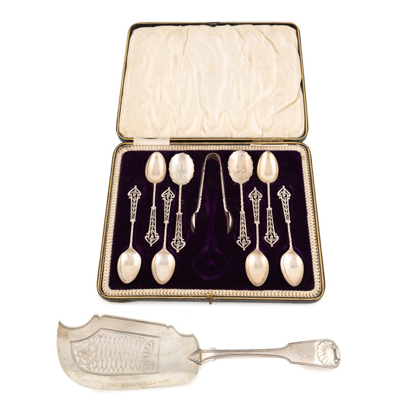 pierced blade, the terminal initialled, plus a set of six silver teaspoons, a pair of sugar tongs and two jam spoons, in an associated case, approx. total weight 9.7oz. (10)