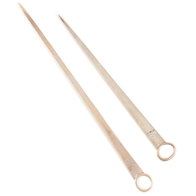 plain tapering form, ring handle, engraved with a crest, plus another George III silver meat skewer, possibly by Gabriel Wirgman, London 1791, tapering form, plain ring handle, engraved with a crest, approx. total weight 5.8oz. (2)