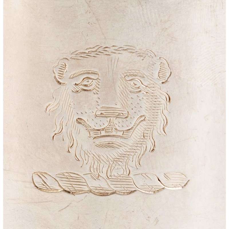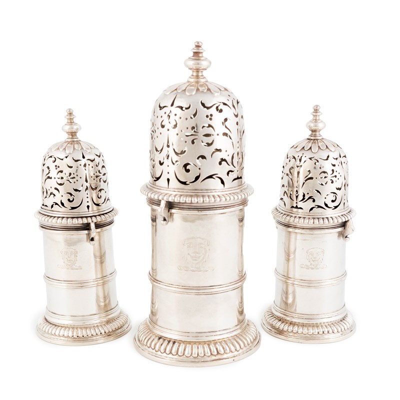 lighthouse form with gadrooned borders, bayonet fitted pierced scroll covers with knop finials, engraved with crests, height 18.3cm, total approx. weight 23.2oz. (3)