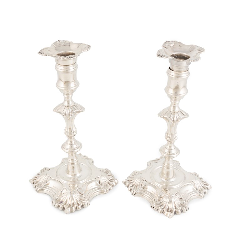 knopped baluster form, shell-capped shoulders, spool-shaped capital with pull-off drip pans, on squared-shaped bases with shell decoration with an engraved crest, height 22.3cm, total approx. weight 34.4oz. (2)