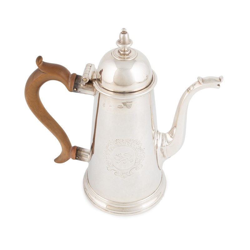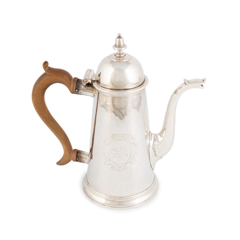 tapering circular form, engraved with a crest in a scroll cartouche, hinged cover with acorn finial, height 21.7cm, approx. weight 22.8oz.