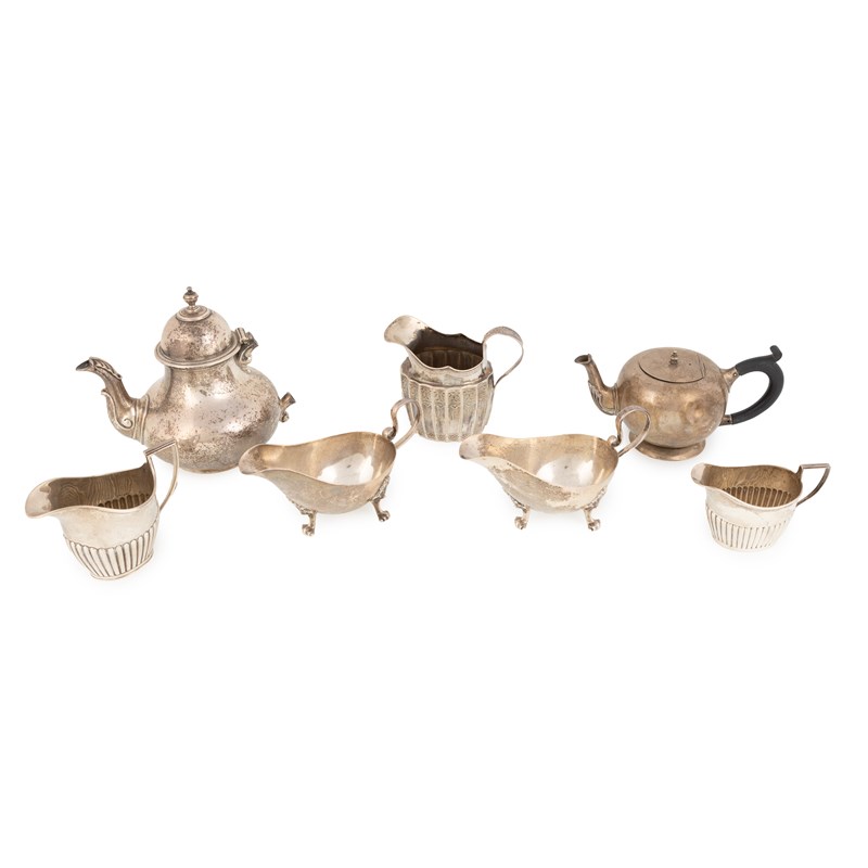 comprising: a Victorian teapot (a/f) by Garrards, London 1852, an Edwardian teapot, three cream jugs and a pair of sauceboats, total approx. weight 48oz. (7)