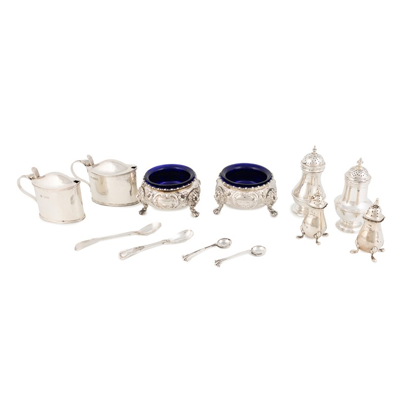 comprising: a pair of Victorian salt cellars by Henry Holland, London 1856, two mustard pots, four pepper pots, a pair of salt spoons, a mustard spoon and an electroplated mustard spoon, total approx. weighable 25.1oz. (12)