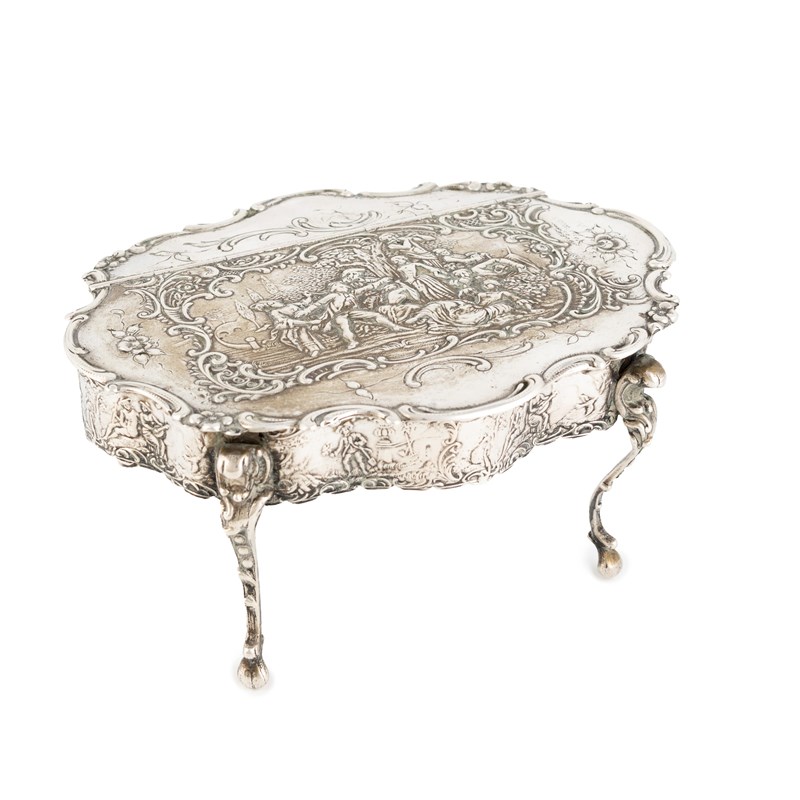 in the form of a dressing table with embossed scenes of figures in rural landscapes, length 16.4cm, approx. weight 10.9oz.
