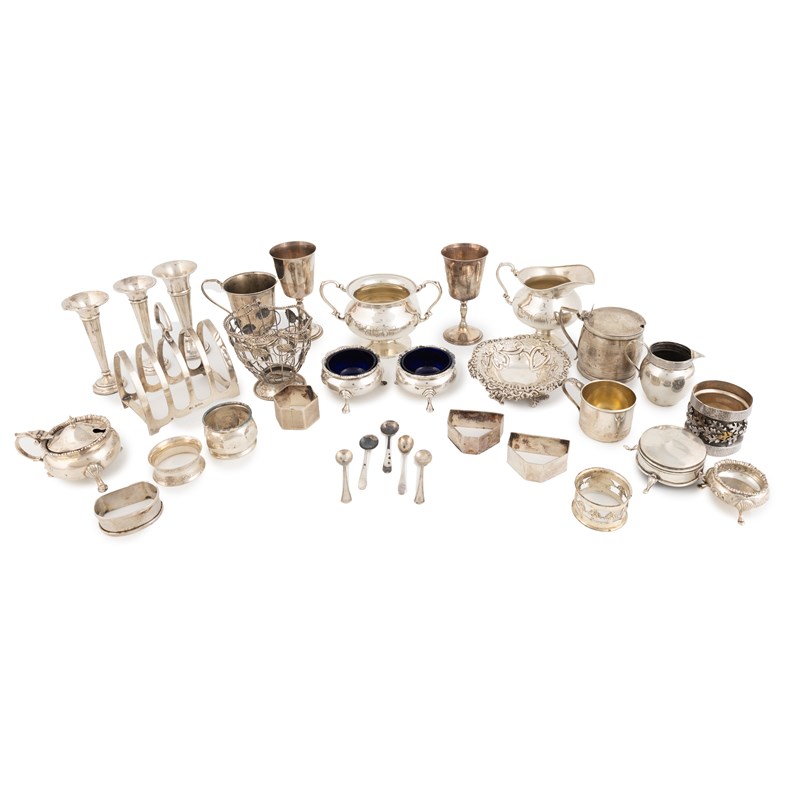 comprising: a George III mustard pot by John Emes, London 1804, two cream jugs, a sugar bowl, two goblets, a toast rack, three salt cellars, a mustard pot, eight napkin rings, two cups, a pierced dish, a swing-handled sugar basket, five salt spoons, a small dressing table pot and three small tulip vases, total approx. weighable 42.7oz. (qty)