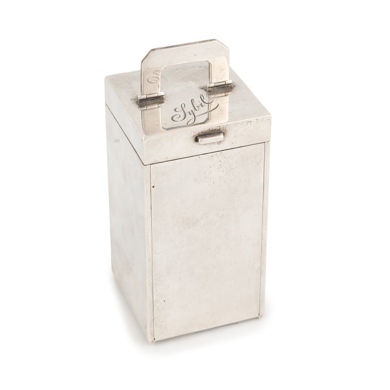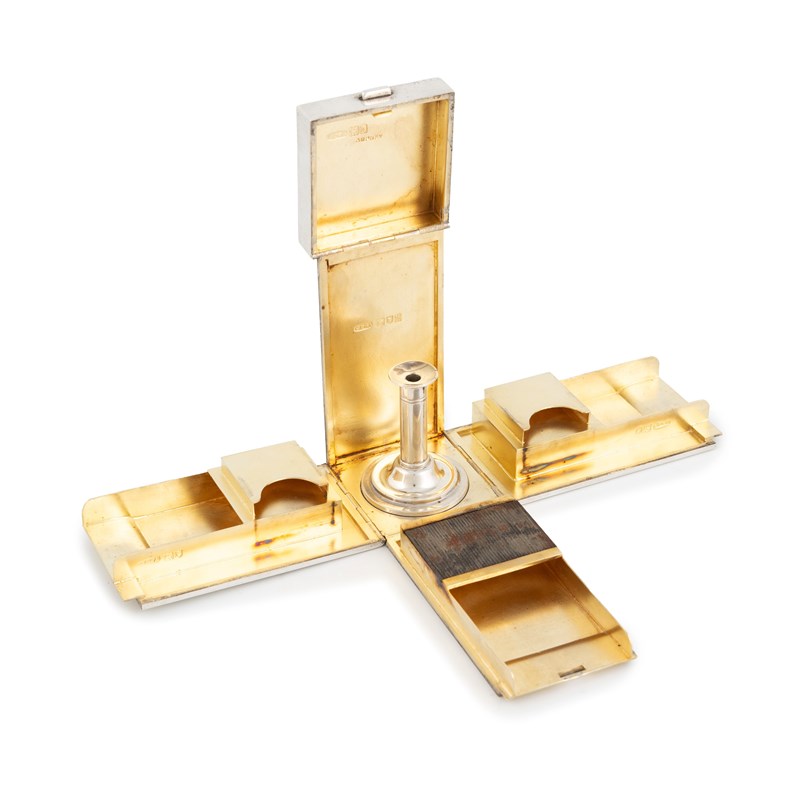 plain rectangular form, the interior with two stamp compartments and three others and striker, with a taperstick and seal, height 8.4cm, approx. weight 7.6oz.