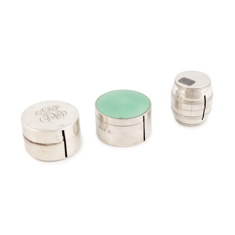 in the form of a barrel with a screw-off bottom and pierced slit to the side, plus a an American silver stamp dispenser by Battin & Co, Newark circa 1904, circular form with engraved initials to the cover, and American silver stamp dispenser, no apparent maker's mark, circular form with an enamelled cover and engraved initials, total approx. weight 4.9oz. (3)