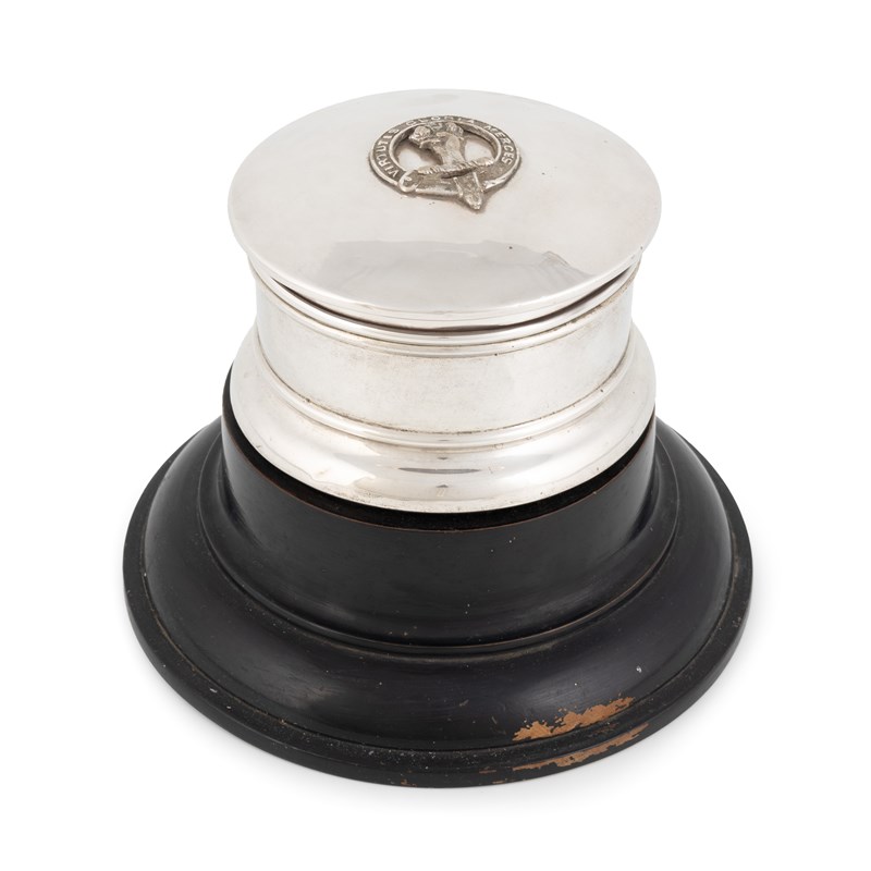 circular form, the hinged cover applied with the crest badge of Clan Robertson, to the gilded interior a central inkwell and five stamp recesses, diameter 12.2cm, plus an associated later stand.