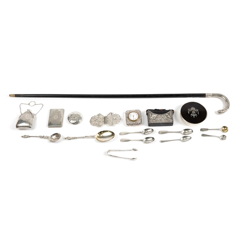 comprising: a silver-mounted walking stick, a purse, two lids, a belt hook, a silver-mounted clock, a memoranda and address book holder, four teaspoons, two salt spoons, a pair of sugar tongs, two modern apostle spoons and a silver-mounted tortoiseshell box, total approx. weighable 12.9oz. (17)