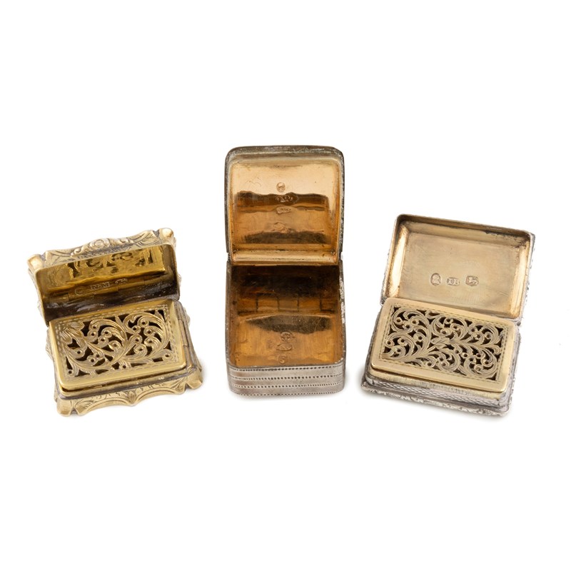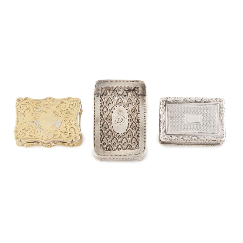 shaped rectangular form, engraved decoration, the cover initialled, plus a silver-gilt vinaigrette, by Nathaniel Mills, and a silver vinaigrette, approx. weight 1.7oz. (3)
