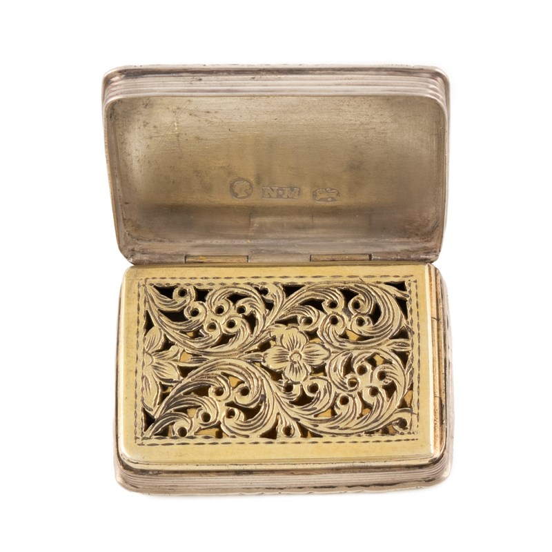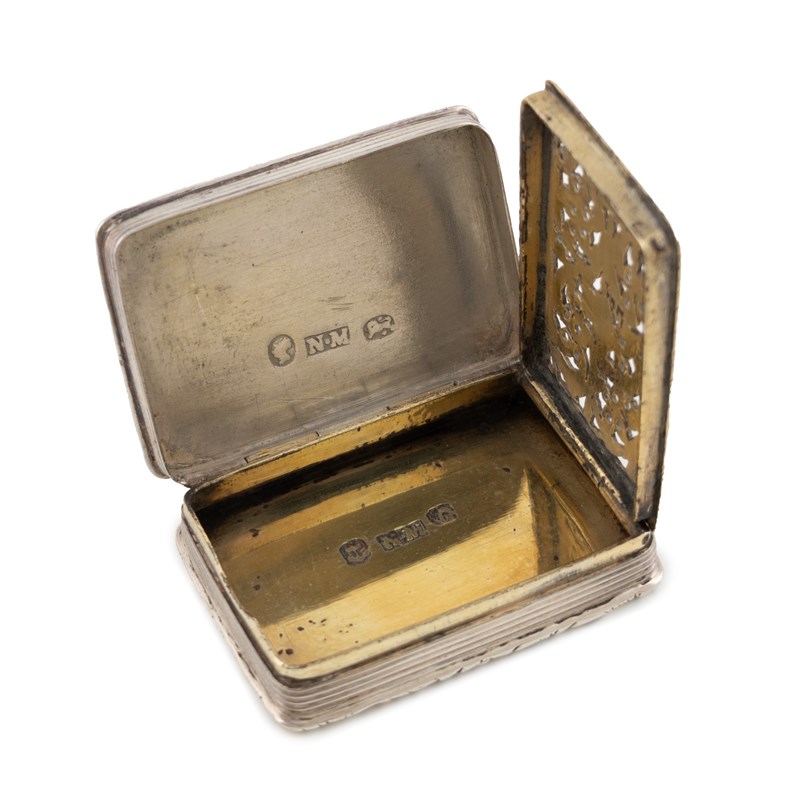 rectangular form, the cover with a scene of Windsor Castle, the interior with a pierced and engraved silver-gilt foliate scroll grille, reeded sides and engine-turned base, with an initialled cartouche, length 3.7cm, approx. weight 0.7oz.