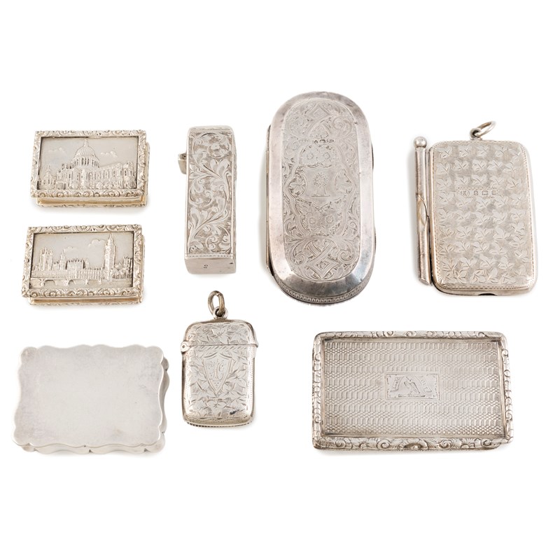 comprising: two modern 'Castle-top' pill boxes, by C.J.Vander, London 1973, the covers with scenes of St. Paul's Cathedral and The Houses of Parliament, plus an oblong box, engraved decoration, two snuff boxes, a scent bottle, a vesta case, and a notepad and pencil, approx. weight 9oz. (8)