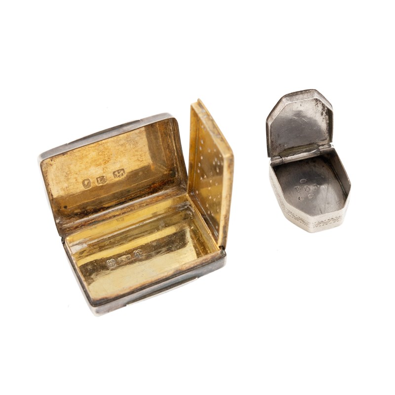 rectangular, engraved tartan decoration, plus a George III silver patch box, by Samuel Pemberton, Birmingham 1797, rectangular form, canted corners, bright-cut decoration, approx. total weight 1oz. (2)