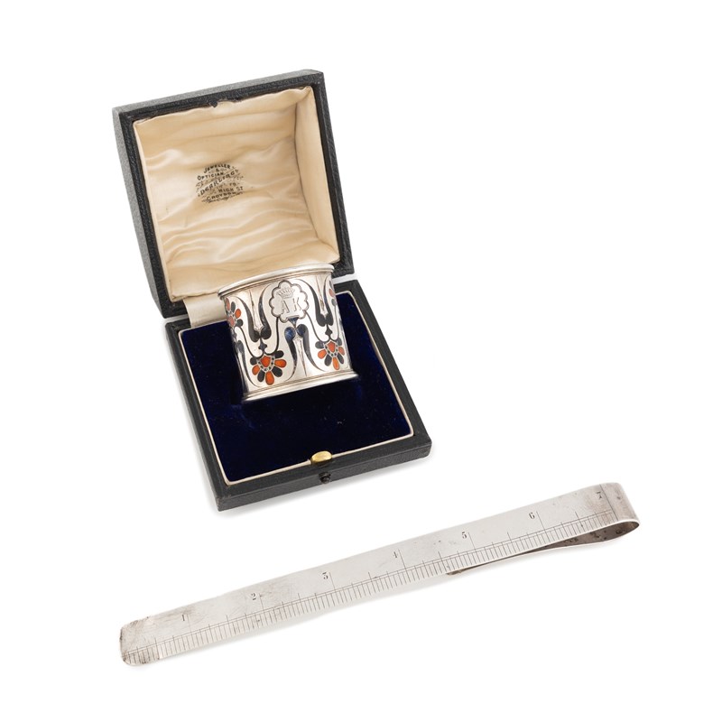 rounded rectangular form with engraved dimensions, length 18.9cm, plus a Russian silver and enamel napkin ring, total approx. weight 3oz. (2)