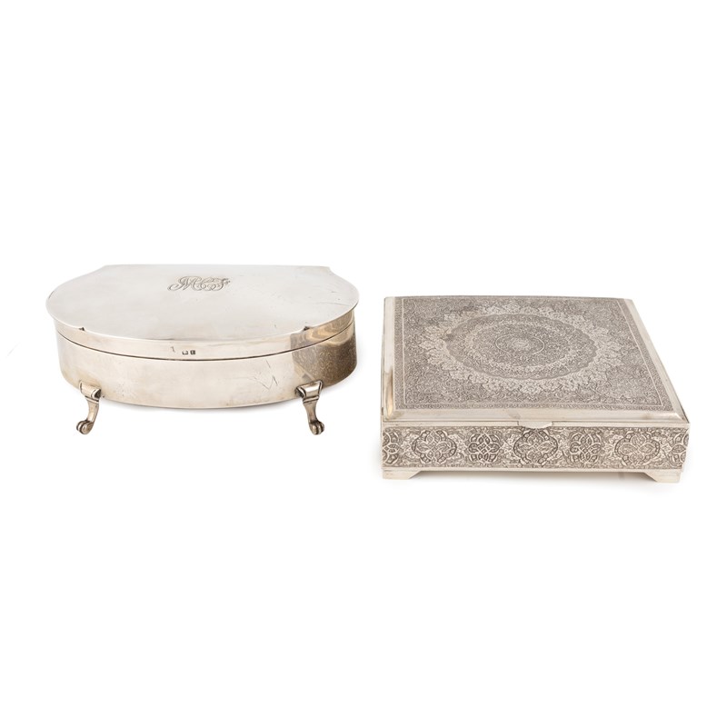 shaped oblong form, engraved initials to the cover, on four paw feet, length 16.4cm, plus an Iranian silver dressing table box, total approx. weight 23.7oz. (2)
