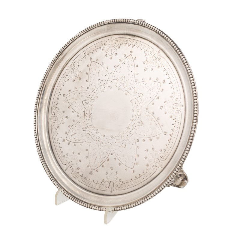 circular form, engraved decoration, beaded border, on three pierced bracket feet, diameter 20.5cm, approx. weight 11.5oz.