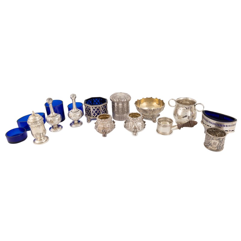 comprising: a pair of Victorian salt cellars, by John Beresford, London 1890, with Teniers tavern scenes, a pair of Edwardian pepper pots, Birmingham 1903, modelled as rose water sprinklers, an octagonal salt cellar, Sheffeild 1849, two other salt cellars, an ox-eye cup, a dressing table pot, a pepper, a napkin ring a minaiture saucepan, and four blue glass liners, approx. weighable 28oz. (qty)