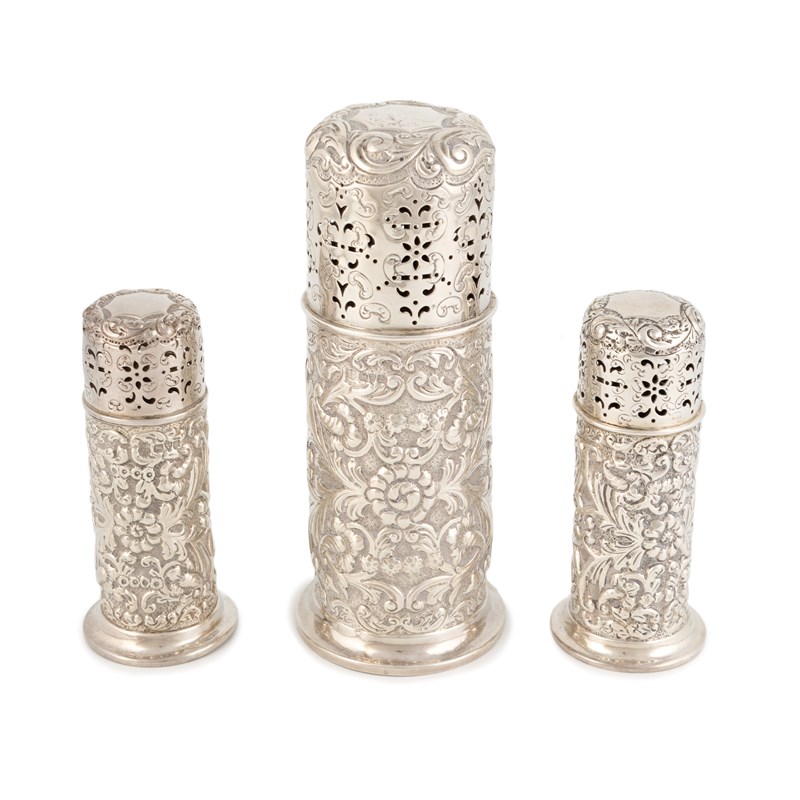 cylindrical form, chased foliate scroll decoration on a matted background, pierced covers, height of larger 17cm, approx. weight 13oz. (3)