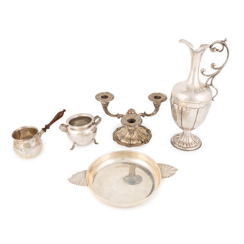 comprising: a Peruvian candelabra, an American brandy pan, a two-handled dish, a ewer, and a two-handled bowl, total approx. weighable 16.5oz. (5)