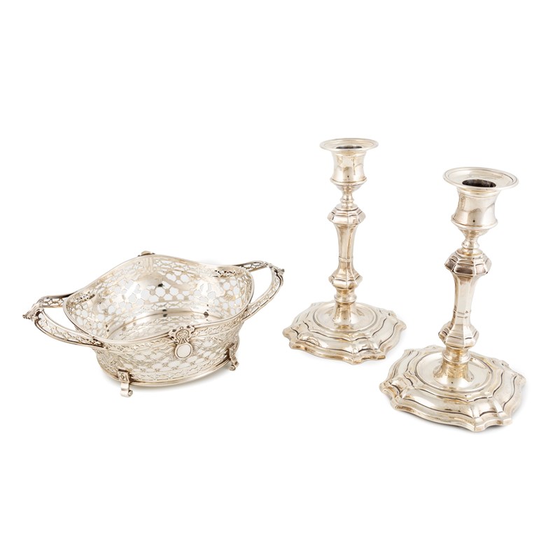 knopped baluster form, spool-shaped capitals with pull-off drip pans, on shaped square bases, height 18.4cm, plus a silver two-handled pierced basket by Mappin & Webb, London 1917, total approx. weighable 10.9oz. (3)