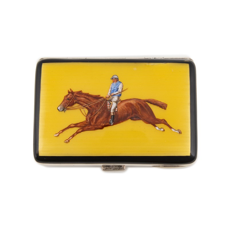 rectangular form, yellow enamel decoration with a black border, the cover with a painted horse and jockey, length 9.1cm, approx. weight 5.1oz.