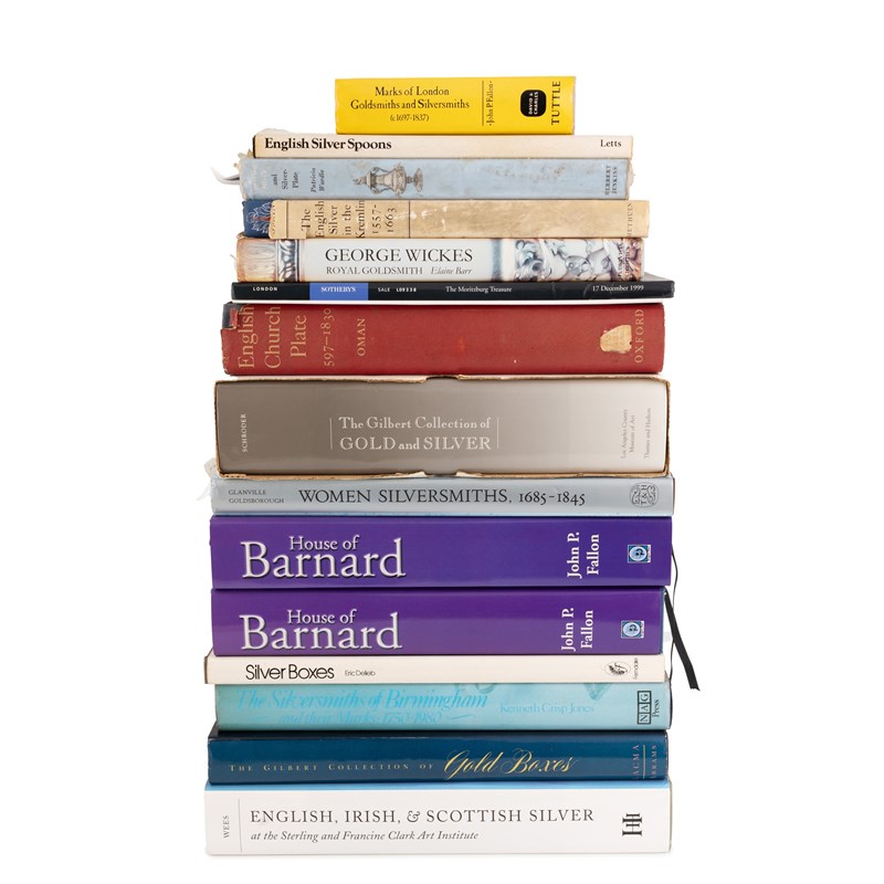 comprising: Fallon, J.,The House of Barnard, 2012 (two copies), The Silversmiths of Birmingham, Women Silversmiths, The Gilbert Collection of Gold and Silver, English, Irish and Scottish Silver at the Sterling and Francine Clark Art Institute, English Church plate, and other volumes. (qty)