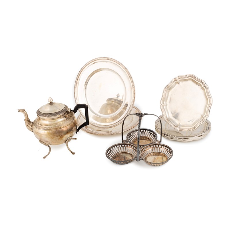 comprising: a small teapot, circular form, foliate borders, four circular dishes with moulded borders, a pierced basket and two circular plates, approx. total weight 41oz. (8)