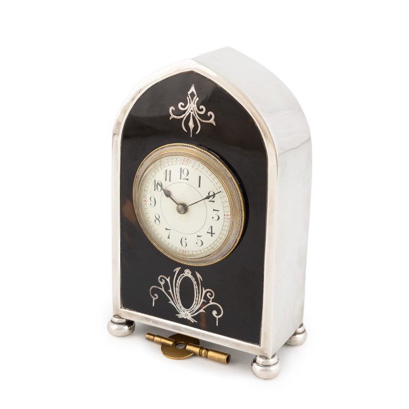 Gothic arch form, the front with a tortoiseshell panel inlaid with silver scroll decoration, plain sides and back, on four bun feet, with a key, height 16.5cm.