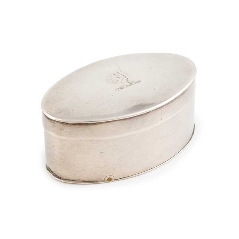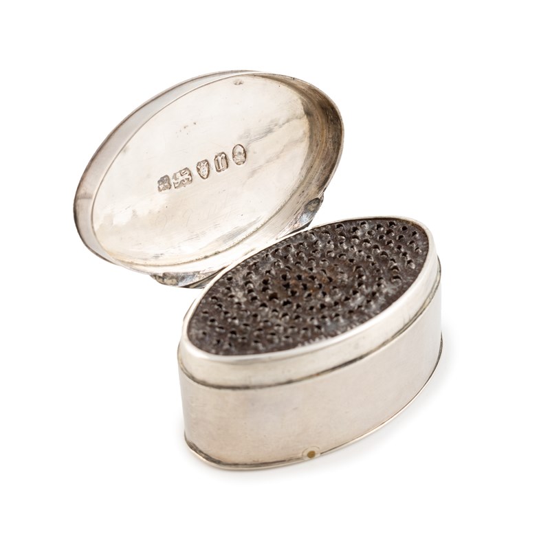 oval navette form, the hinged cover with a crest, a hinged base, the interior with a steel grater, length 5.3cm, approx. weight 1.5oz.