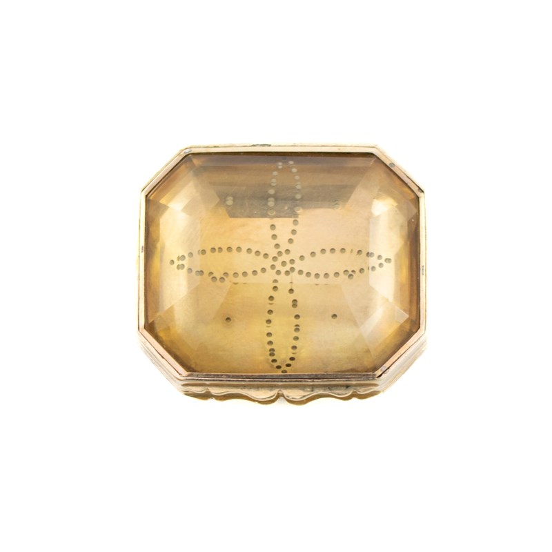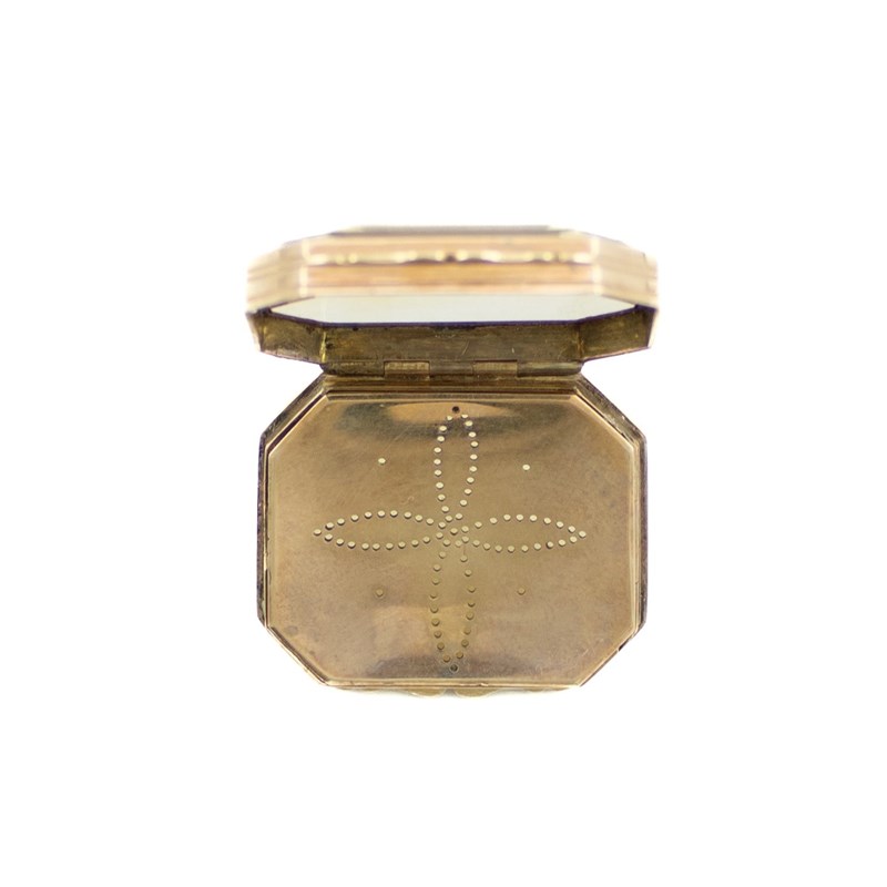 rectangular form with canted corners, reeded decoration to the mounts, the cover and base are set with cut citrine, a pierced hinged grille, length 2.7cm.